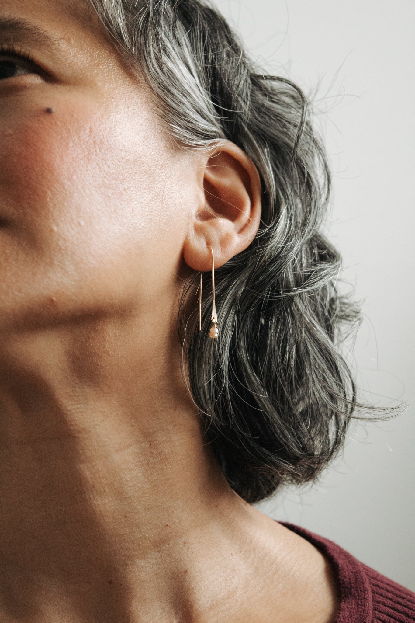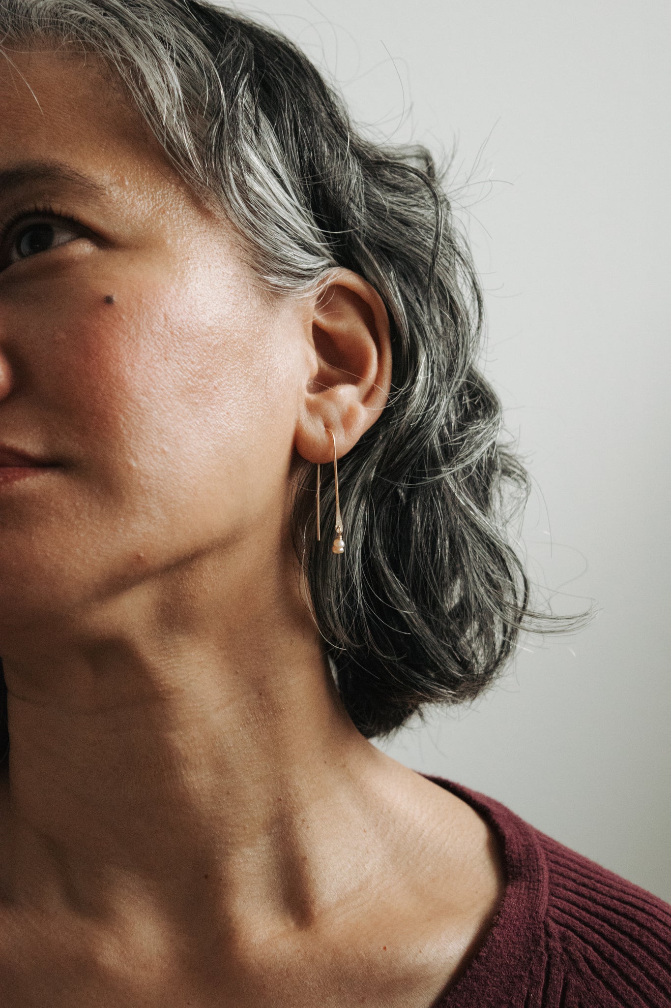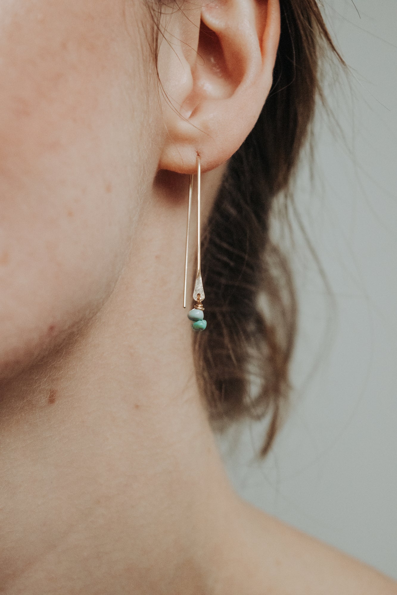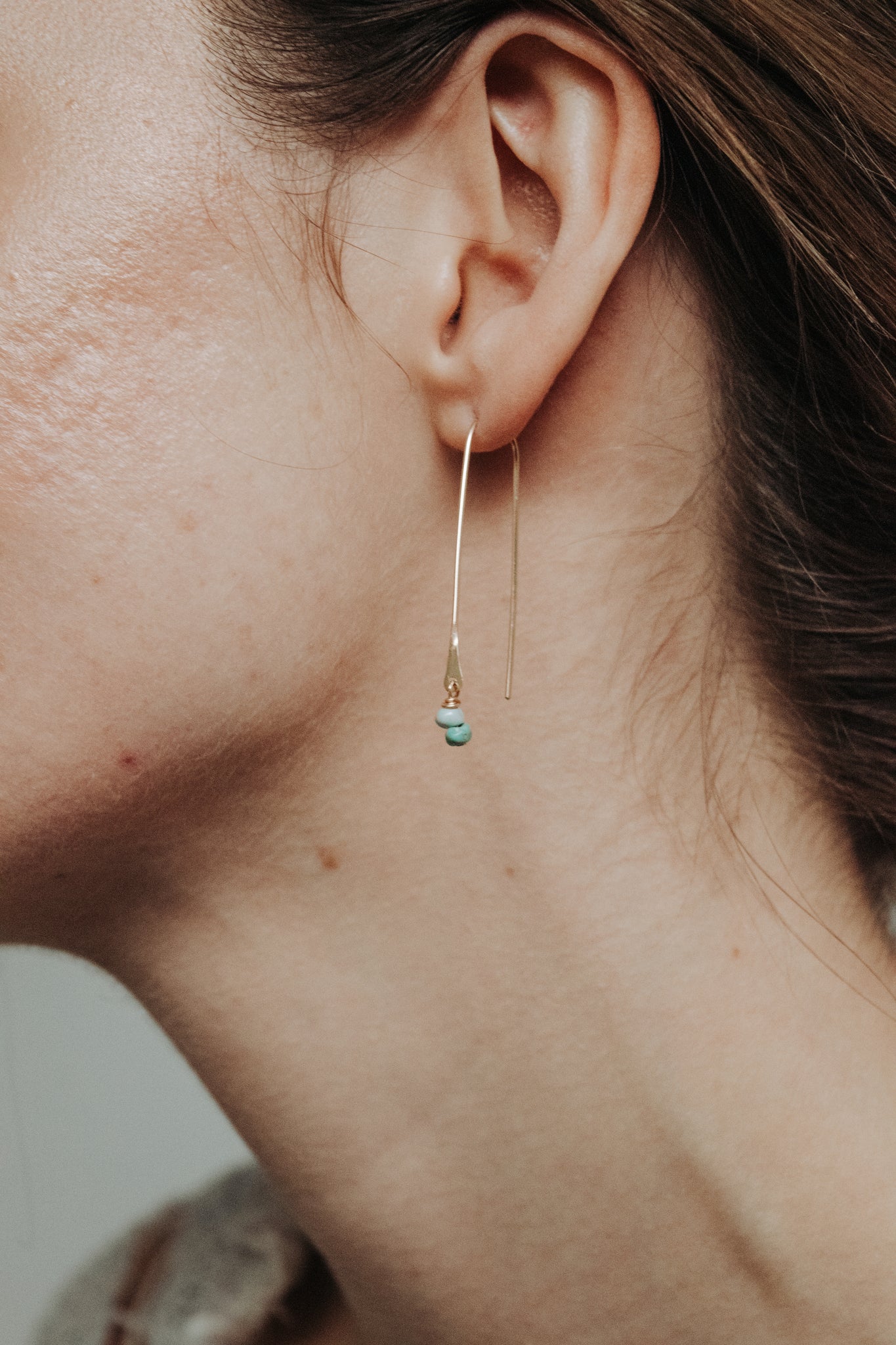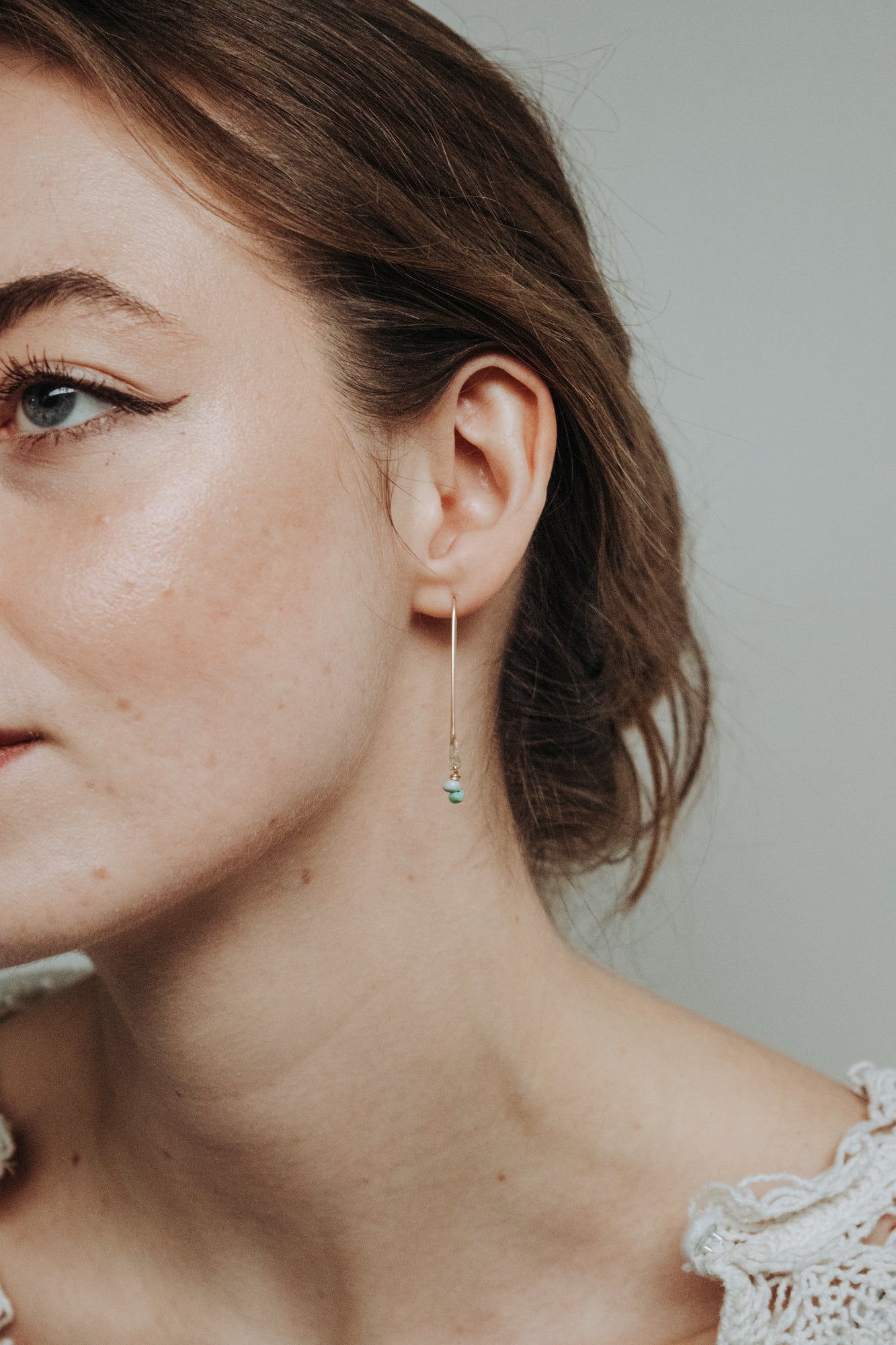 These handmade threaders earrings feature your choice of stonethat dangles with soft, effortless movement.  These threaders are lightweight and versatile, perfect for everyday wear or that special event! Choose from Turquoise, Opal, or Freshwater Pearl