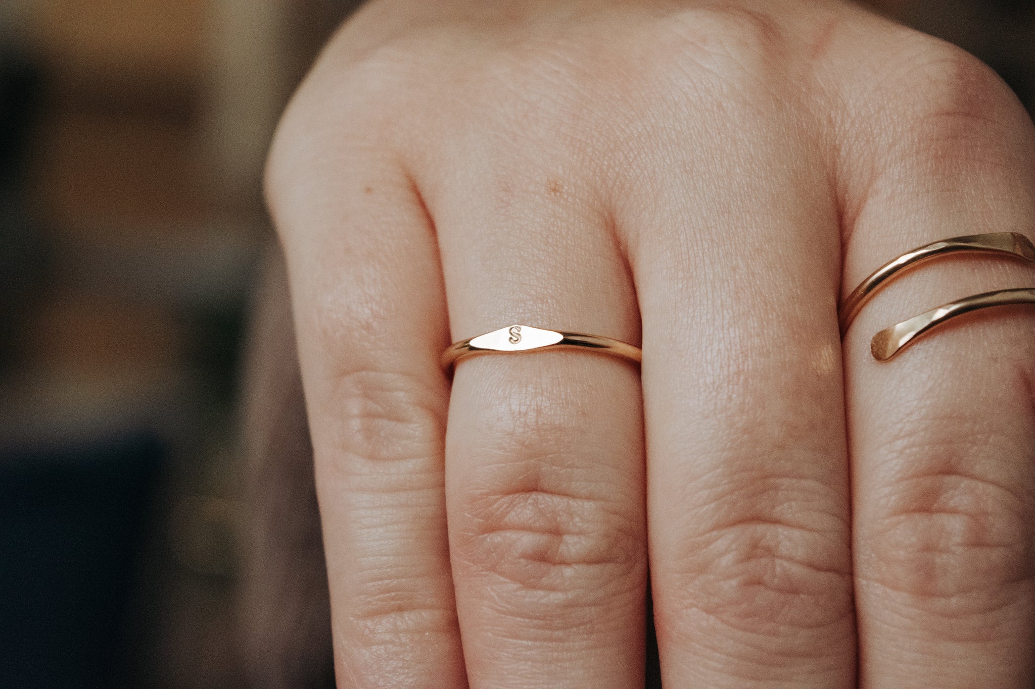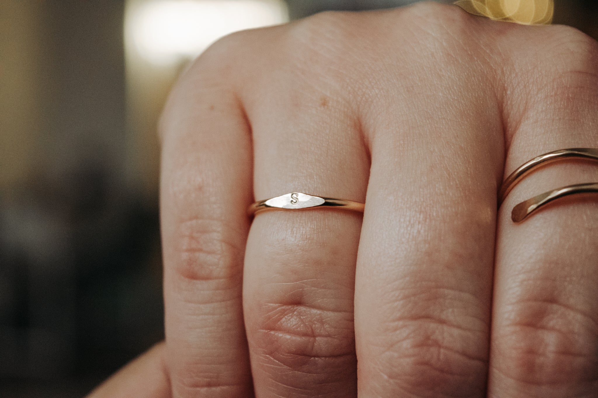 This stacking ring features a slim band with a hand-stamped initial on top, creating a personalized, minimalist piece that layers beautifully with other rings. Choose your size and leave the letter you would like stamped in the option box.