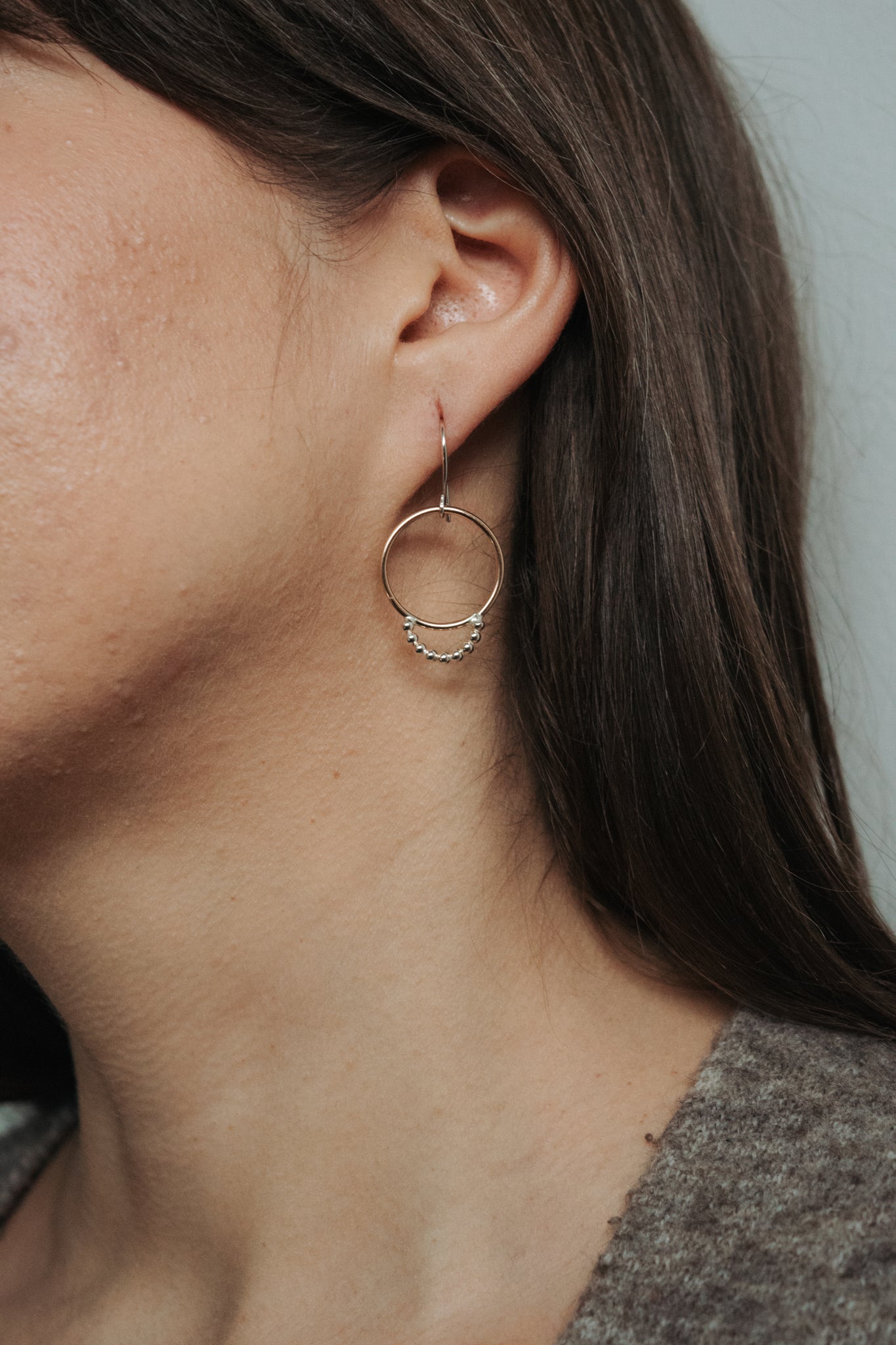The Moonbeam Earrings feature a polished circle in either Sterling or Gold Filled, illuminated by a delicate arc of the opposite metal. Timeless mixed-metal earrings to go with anything!
